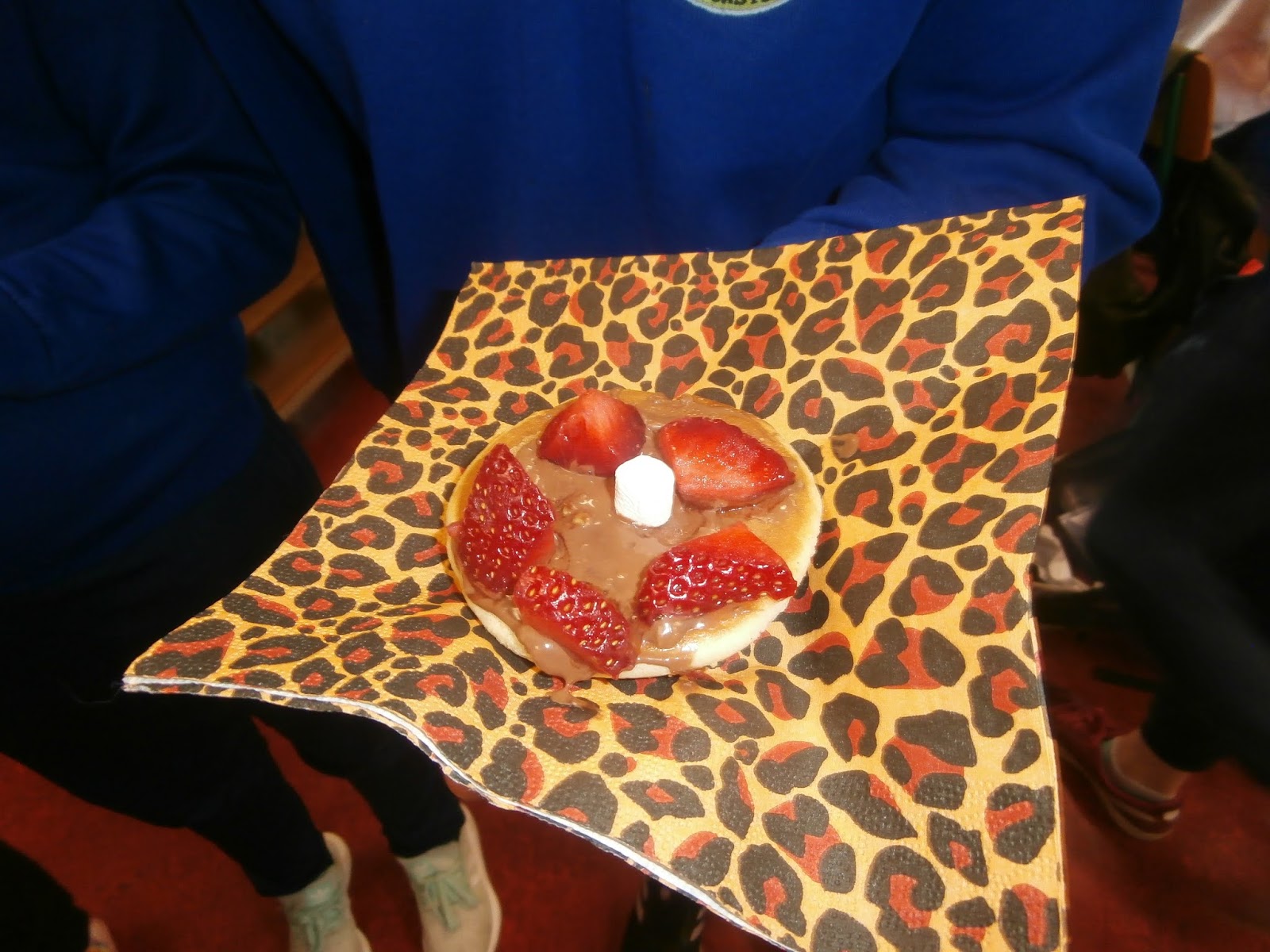 We had great fun on Pancake Tuesday. Ms Treacy cut grapes, pineapple, mango and strawberries for us. We got 2 pancakes each and we had to make a smiley face out of the fruit and toppings on our pancake. They were yummy.